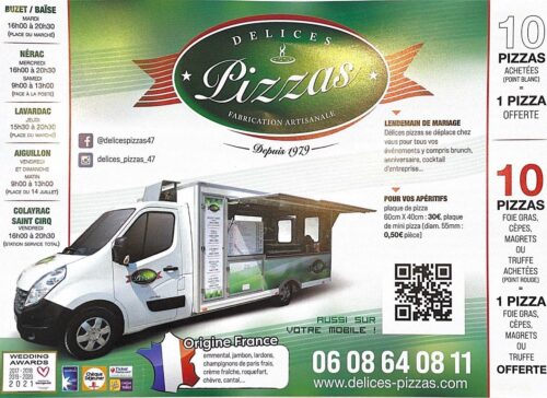 Délices Pizza c'est un camion itinérant en Lot-et-Garonne pour être toujours au plus près de nos clients avec une équipe passionnée et engagée à votre service.Depuis notre création en 1979, nous avons constamment cherché à améliorer la qualité de nos pizzas, en choisissant les meilleurs ingrédients et en peaufinant notre savoir-faire culinaire. Nous avons aussi élargi notre gamme de pizzas pour satisfaire toutes les envies et tous les goûts, que vous soyez plutôt végétarien, carnivore ou amateur de fromage.Pensez à Délices Pizzas pour toutes les occasions : mariages, anniversaires, repas d'entreprise, apéritif.